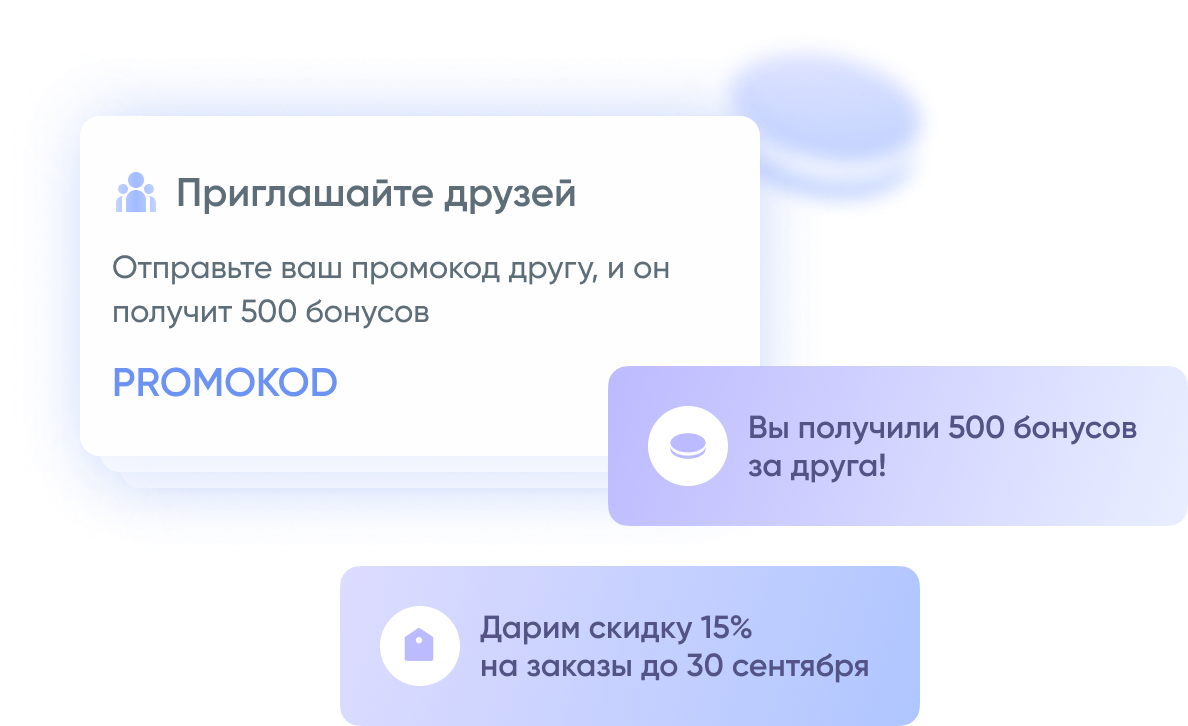 Реферальная программа для ваших клиентов позволяет расширять клиентскую базу без вложения дополнительных средств в маркетинг. Клиент приглашает друзей и получает бонусы, вы получаете нового клиента. За счет наличия крутого УТП по быстрой доставке клиенту проще привлечь новых друзей.